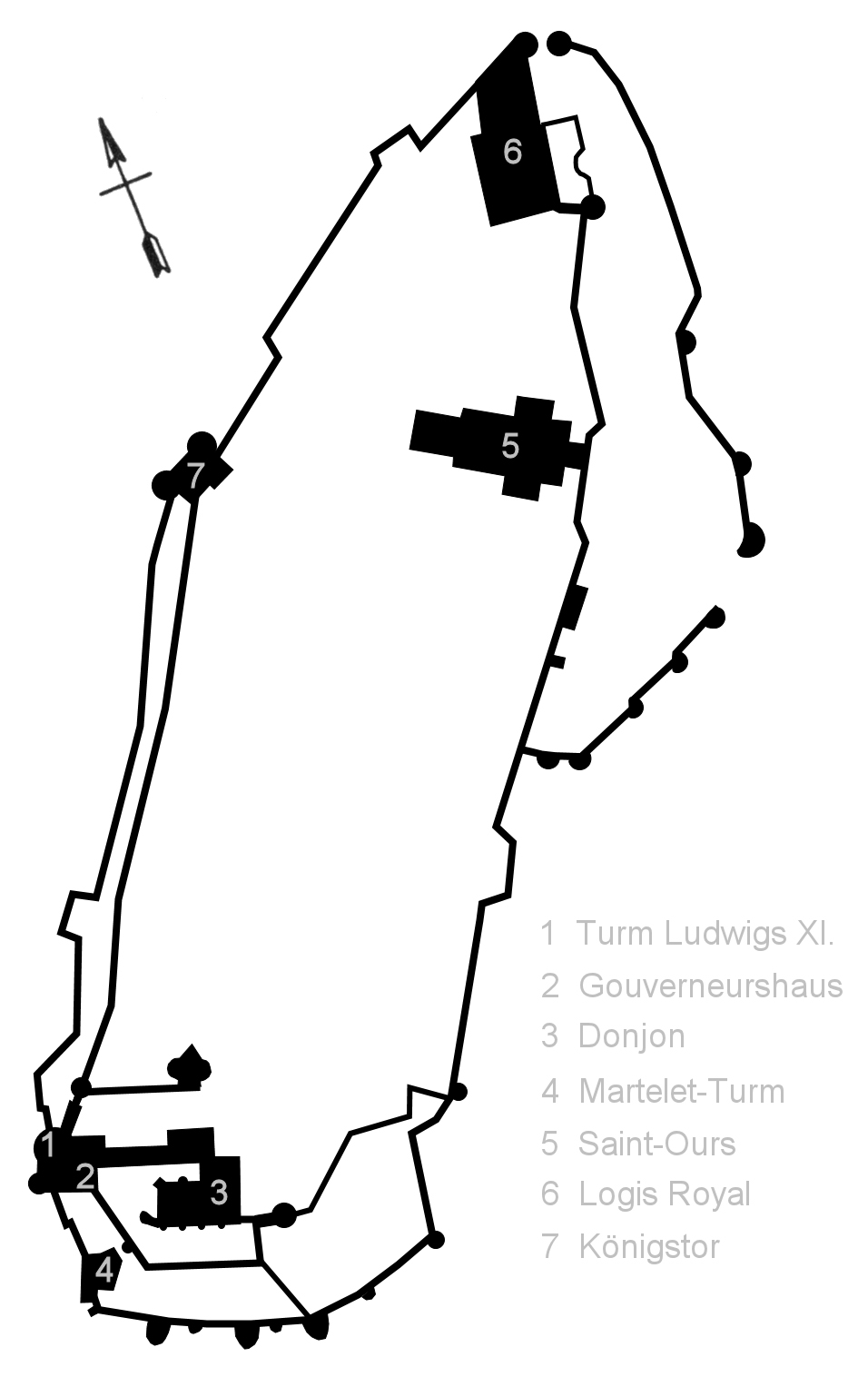 Nas interesuje południowa część wzgórza, gdzie mieści się część określana we francuskim Internecie, jako donjon. Posługując się pojęciami znanymi ze zwiedzania Malborka, powiedziałbym, że całe wzgórze to zamek dolny, południowa część z wysokimi murami, to zamek średni, a najwyższa wieża, to odpowiednik Zamku Wysokiego. To jest właśnie Zamek średni, nazywany przez Francuzów "donjon de Loches"