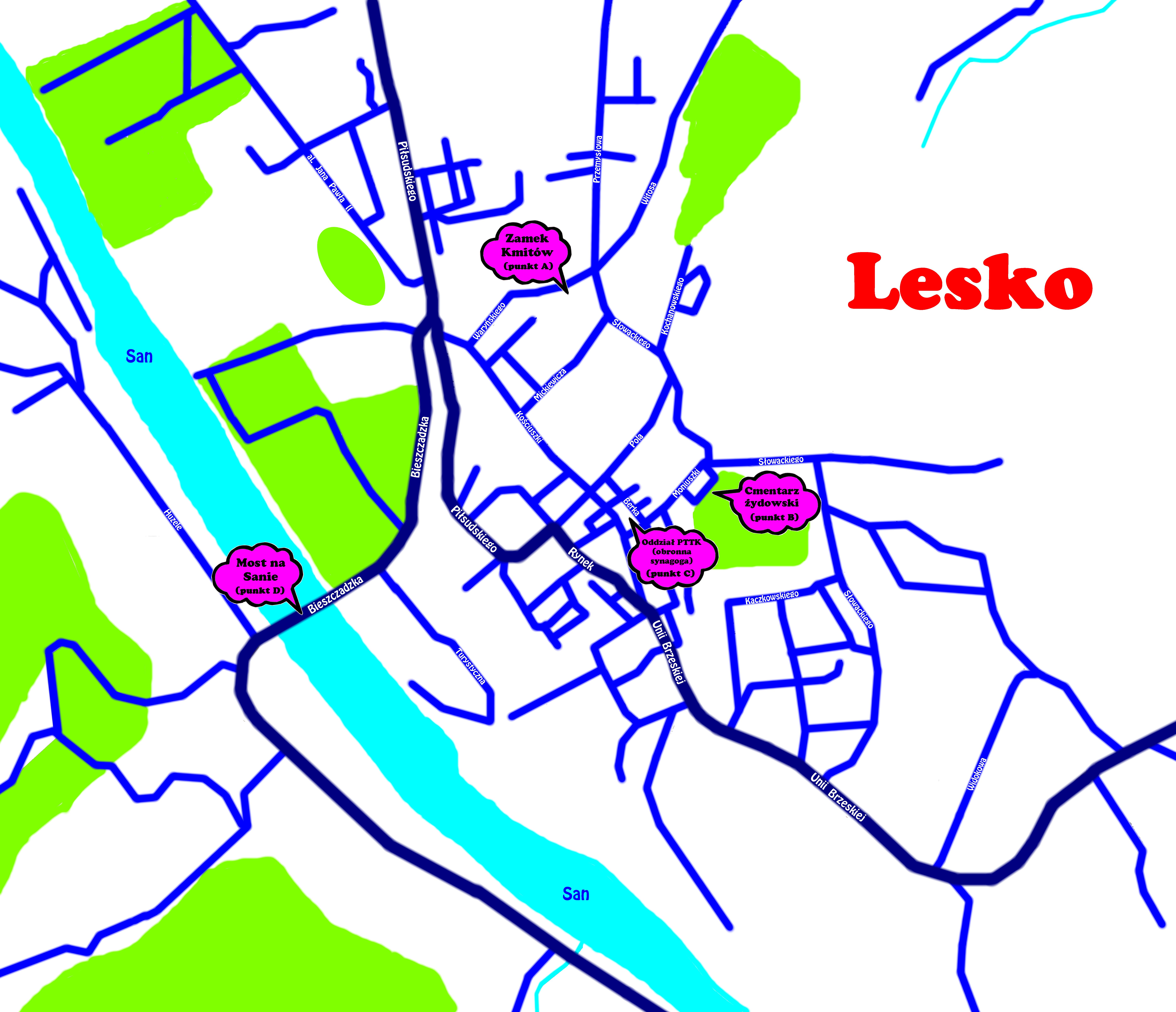 „Za Leskiem motocyklista skręcił na Baligród. Przejechaliśmy most na Sanie (punkt D) i klaksonem dałem Smithowi znak, że będę go wyprzedzał.” (Rzdz 15)