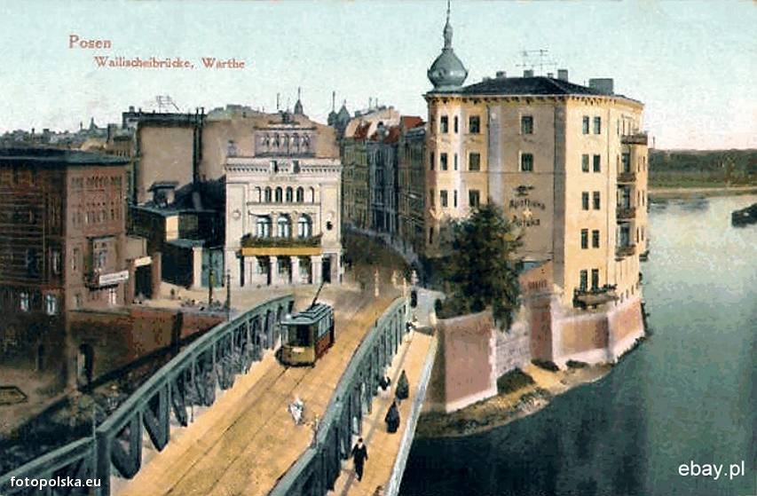 Widać most nad Wartą w kierunku dzielnicy Chwaliszewo. Obecnie koryto Warty zasypane i przeniesione dalej. Na miejscu starego mostu powstała replika oświecona wieczorami lampkami.