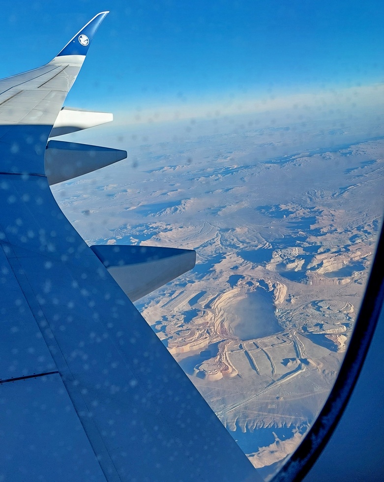 Tu na zdjęciu z okna samolotu, kopalnia miedzi Ascondida na pustyni Atacama , podobno największa kopalnia miedzi na świecie.