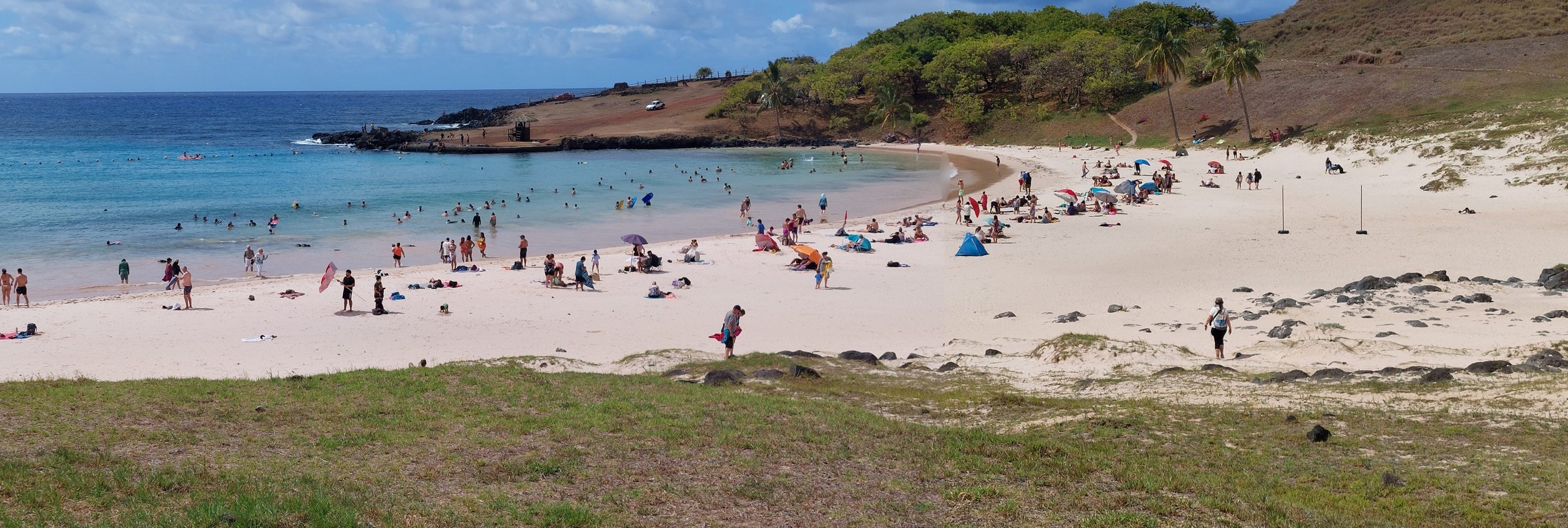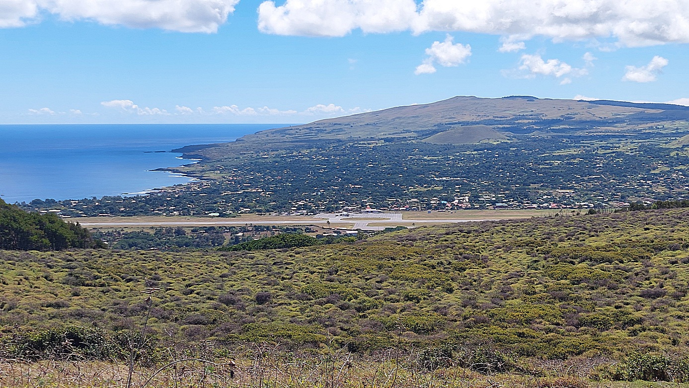Stolicą wyspy jest Hanga Roa, coś pośredniego między miastem a wsią. Na szczęście udało się zapobiec wybudowaniu wysokich hoteli, zabudowa jest parterowa, przyjemne małe hoteliki, sklepy z pamiątkami i restauracyjki. Na pierwszym planie tego zdjęcia widać pas lotniska, wybudowany podobno dla lądowania amerykańskich promów kosmicznych.