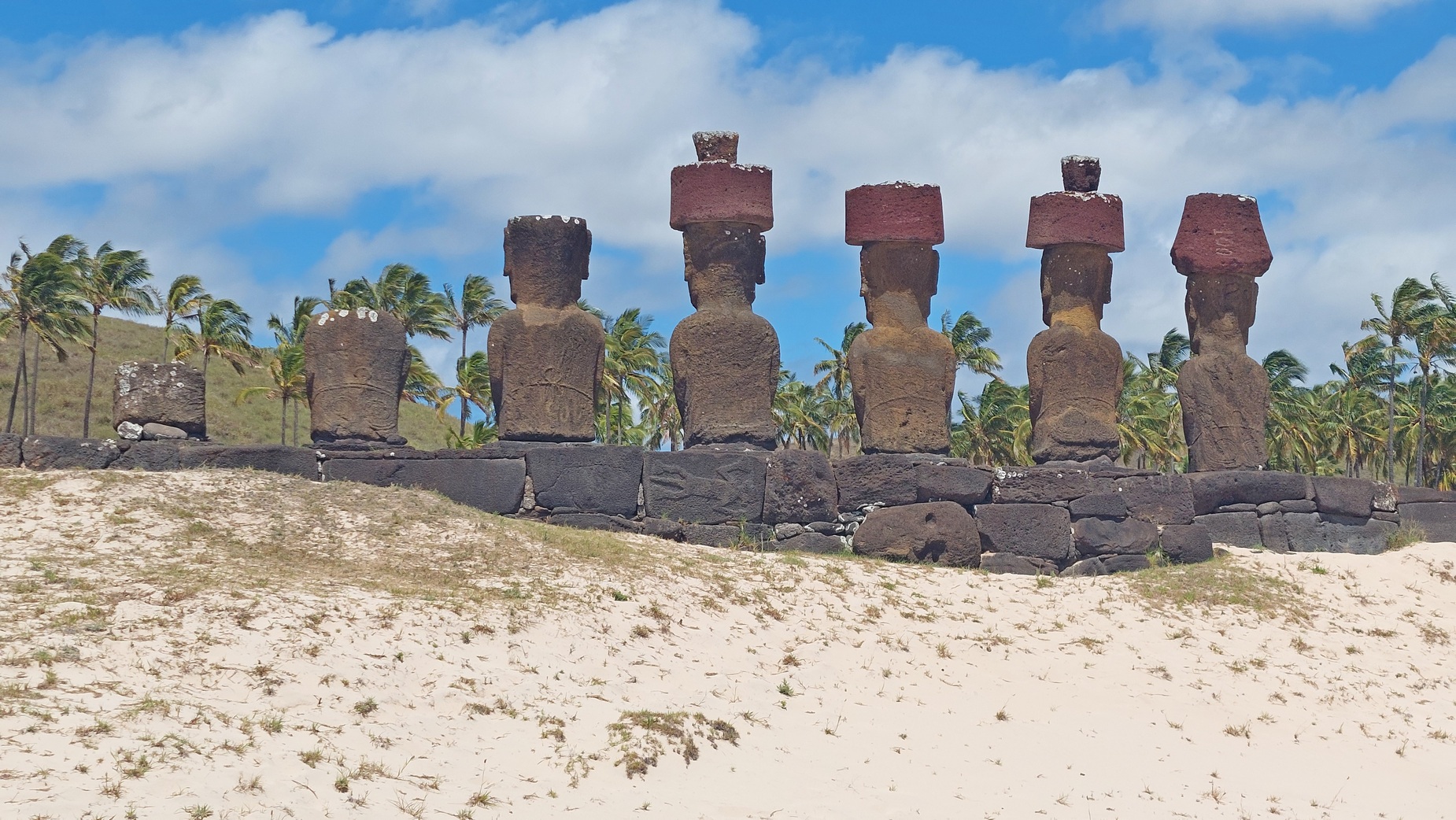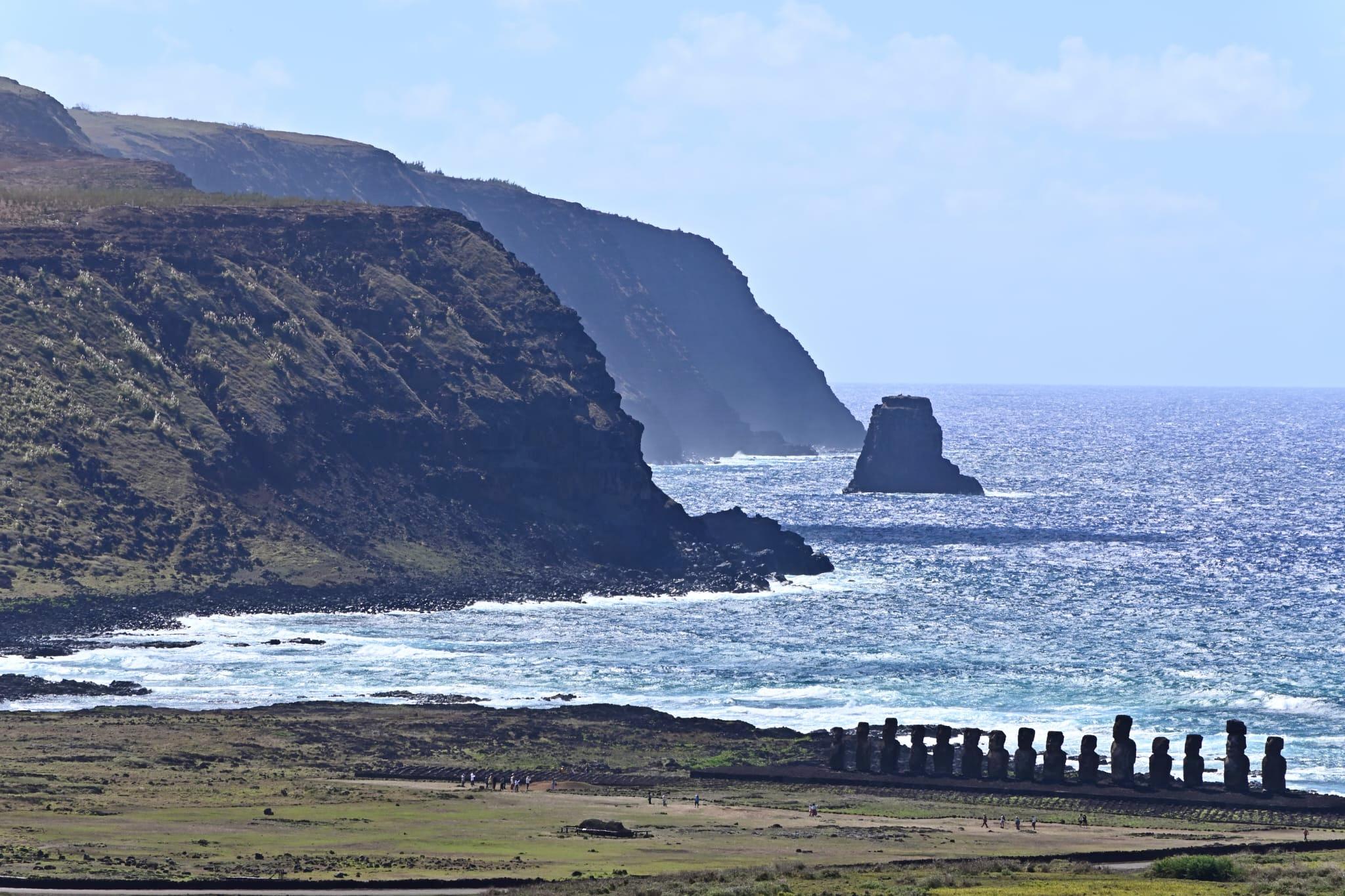 Niektóre niedokończone figury w kamieniołomie Rano Raraku, tkwią jeszcze w skale. Wygląda to jak grobowiec, ale jest wręcz przeciwnie, to miejsce ich narodzin. I na zakończenia plaża Anakena, jedyna na skalistej wyspie.