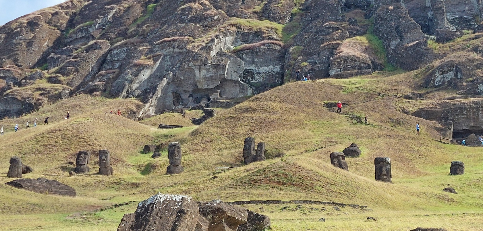 chaty zwykłych mieszkańców Kamiennych figur Moai jest na wyspie ponad 600, część stoi na starożytnych platformach zwanych Ahu Część stoi pojedynczo Część leży Ale największe wrażenie robi kamieniołom na zboczu wulkanu Rano Raraku, gdzie wytwarzano te figury, aby następnie transportować je w inne miejsca Figury sprawiają wrażenie olbrzymów, którzy zastygli w trakcie wydobywania się z Podziemi