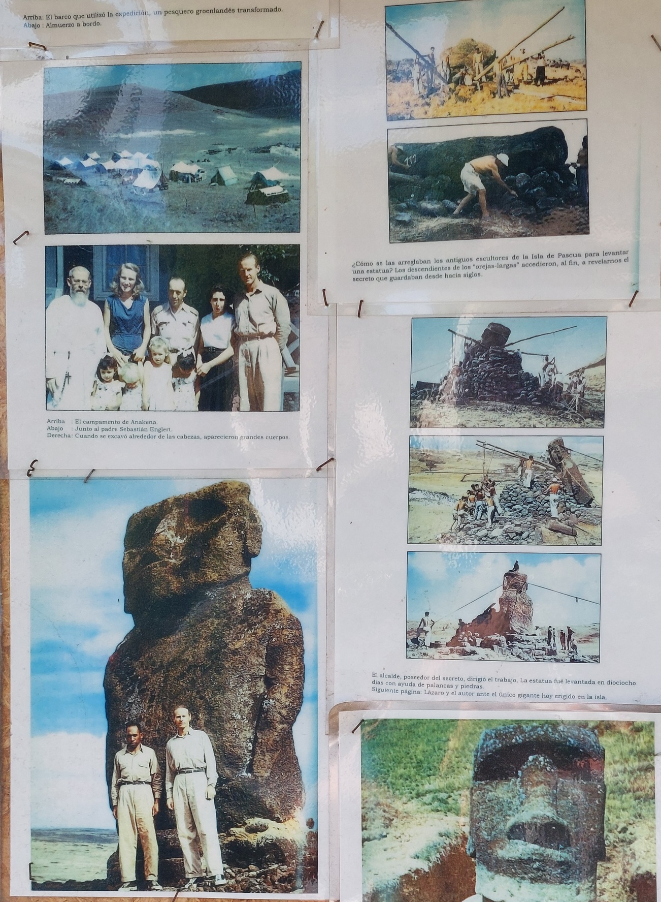 Na zdjęciach widać też scenę stawiania Moai. Kiedy Heyerdahl tu przybył, wszystkie figury leżały na ziemi, oprócz tych zakopanych do połowy w Rano Raraku. Pierwszą postawił przy pomocy mieszkańców. Jak opisuje, nie było to za pieniądze, ale w zamian z zorganizowanie uczty z kilku pieczonych prosiaków