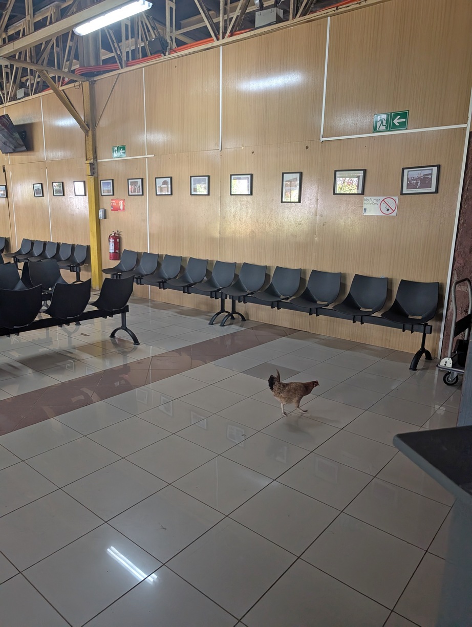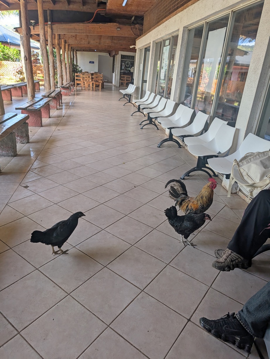 Większość jedzenia i wszystkie produkty przemysłowe są przywożone z Chile. Z własnego jedzenia mają ryby, przede wszystkim tuńczyki i to chyba w dużej ilości. Beata się zajadała, dla mnie to za chude. Podobno na własne potrzeby uprawiają jeszcze bataty i banany. Nie jadłem, bo to też nie moje smaki, za to zajadałem się ananasami. Mają taki małe, ale miękkie i słodkie. No i kury, kury są wszędzie, w restauracjach, na lotnisku, na plaży. Rano pobudka pianiem kogutów, dosłownie chór, w całym miasteczku.